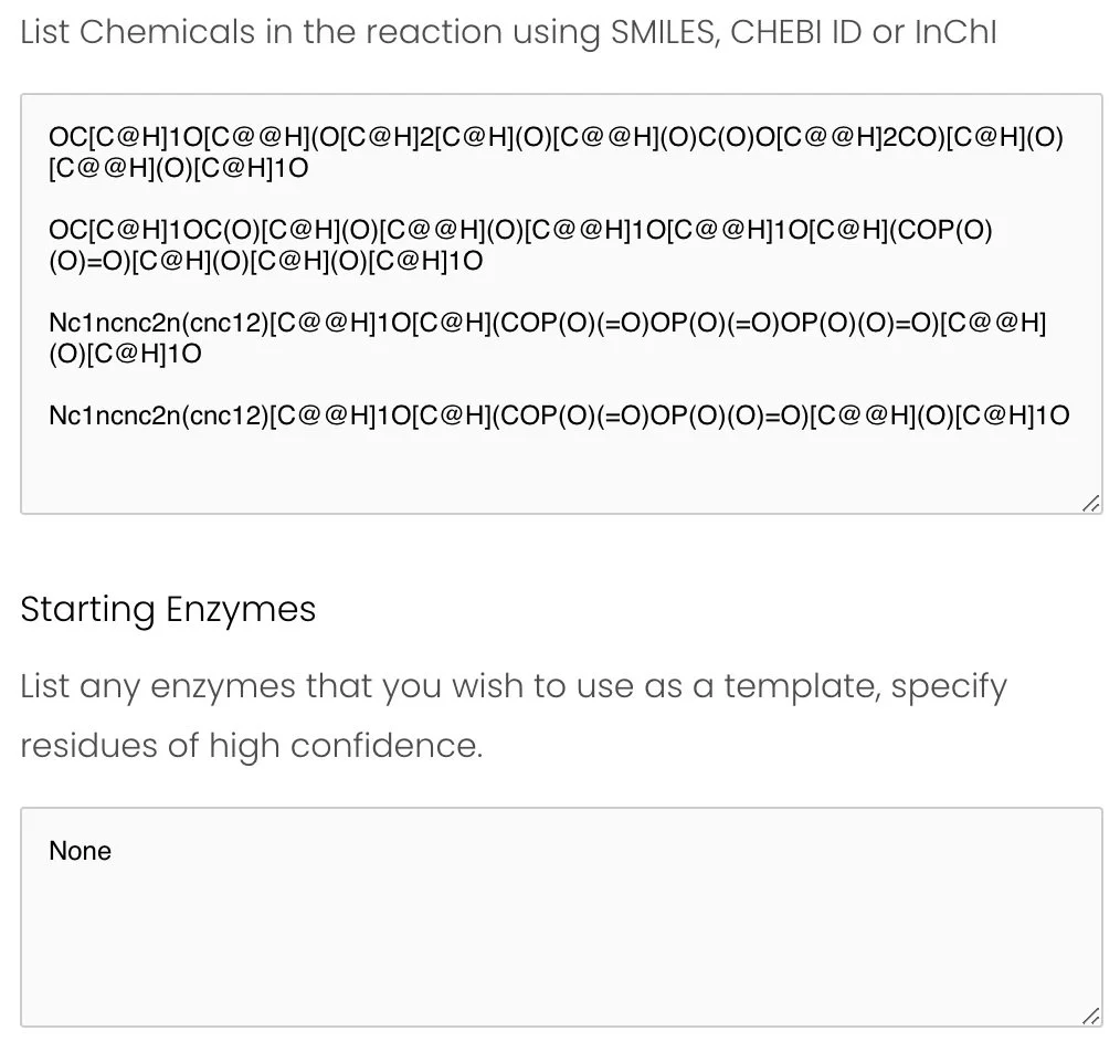 In this example, the client would submit the enzyme request shown below, specifying what chemicals are present in the reaction. The enzyme request accepts SMILES (Smiles Simplified Molecular Input Line Entry System), ChEBI ID Number(Chemical Entities of Biological Interest) , InCHI (IUPAC International Chemical Identifier), or by chemical name.